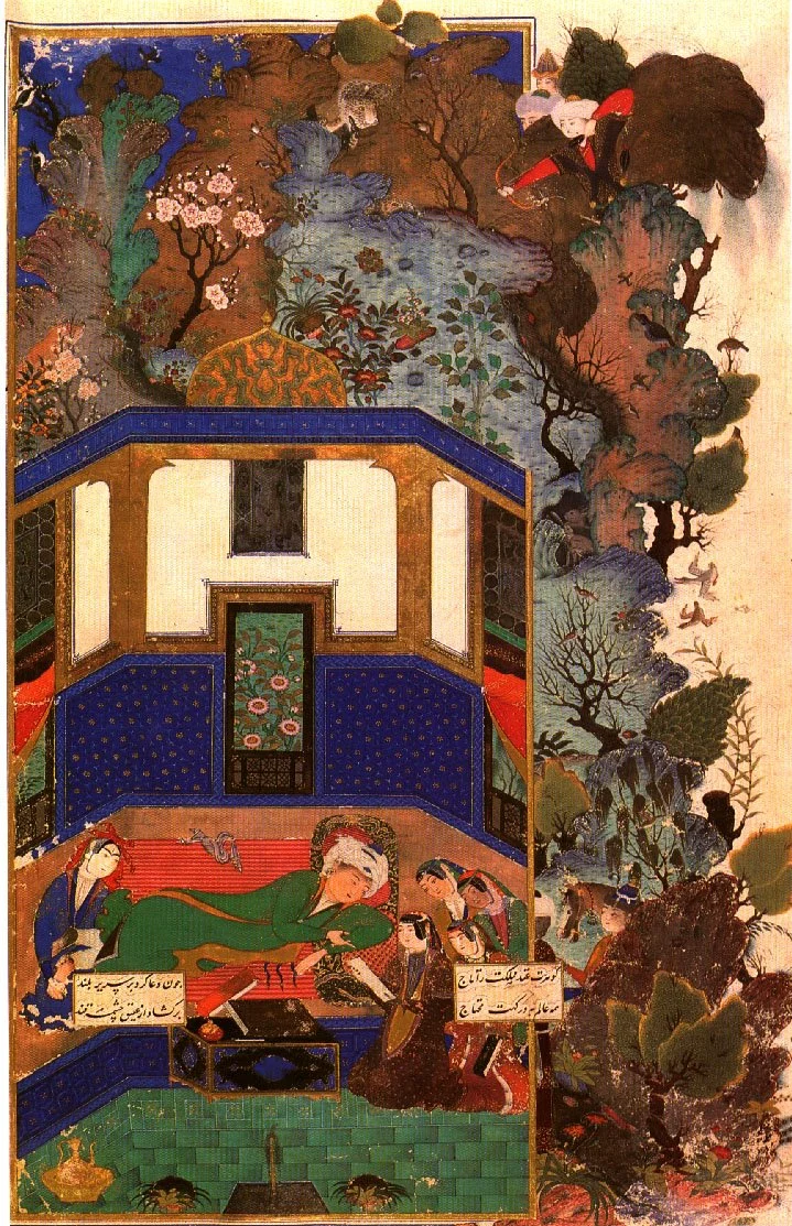 A ghastly turn of events in Iran today. I cannot imagine the fear and the rage that must blanket that country tonight. I am already haunted by a video clip I wish I had not seen, of a young woman in her last moments. What is there to do, but persist? But how many others will be sacrificed to a flailing, jealous regime on its way down? Stupefied, sorrowful, I offer another Persian miniature, for lack of anything else to say. It features a Persian king known for his prowess as a hunter and a lover. But I selected Bahram Gur in the Green Pavilion in honor of green, the color held up by crowds as the hue of Iranian aspiration. Tabriz, 1481.