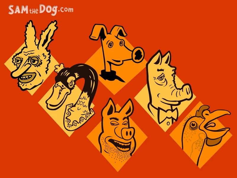 D.B. Dowd, Character Ensemble, Sam the Dog.com, 2001. Back in the day I produced online animation based on the characters I created for an illustrated serial that ran in the St. Louis Post-Dispatch, 1997-99. Again, shown for media contrast: all vector.