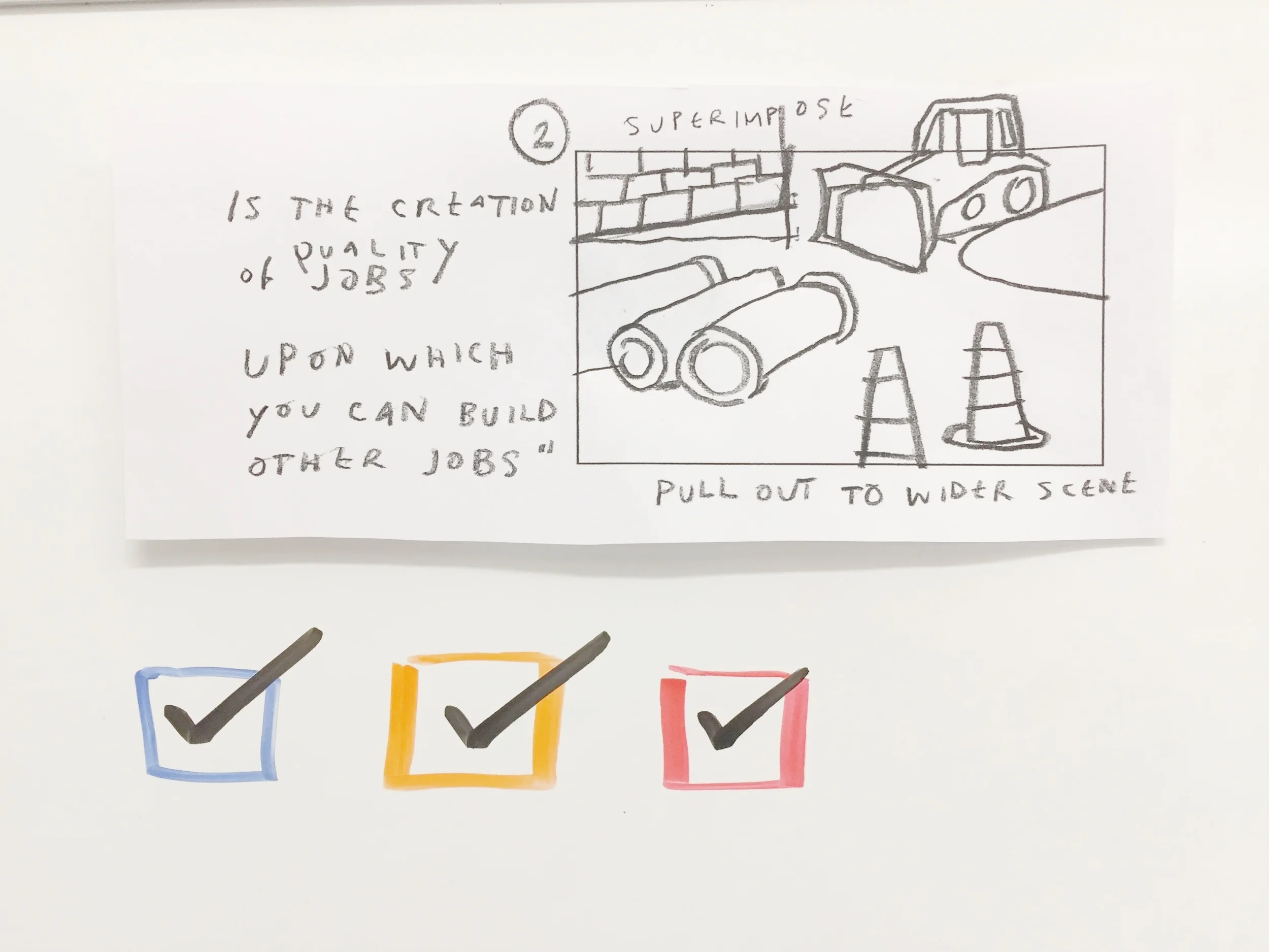 The to-do list: as noted, 1) build a working storyboard; 2) figure out how the shots should look; 3) make some tests to test the approach; 4) develop a palette for the project; 5) start banging out the work; 6) build a system for delivering shots and communicating with Aligned, and 7) fill in the gaps in the storyboard and write clear instructions for movement.